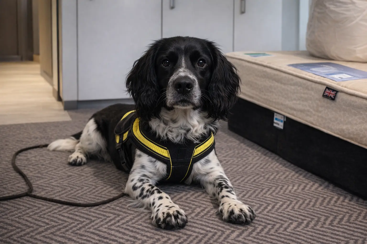 Dizzy is a cocker spaniel with strong scent discrimination skills. He is particularly effective in shared and high-turnover spaces, helping teams pinpoint live activity with precision and consistency.